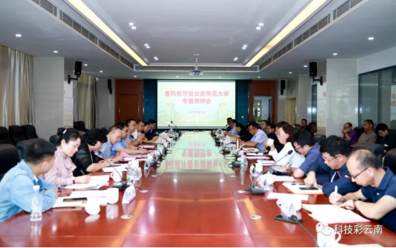 省科技厅副厅长高俊,云南师范大学副校长安学斌,省科技厅办公室、规划处、基础处、农村处、社发处、宣教中心负责人,云南师范大学相关部门、学院负责人参加调研。