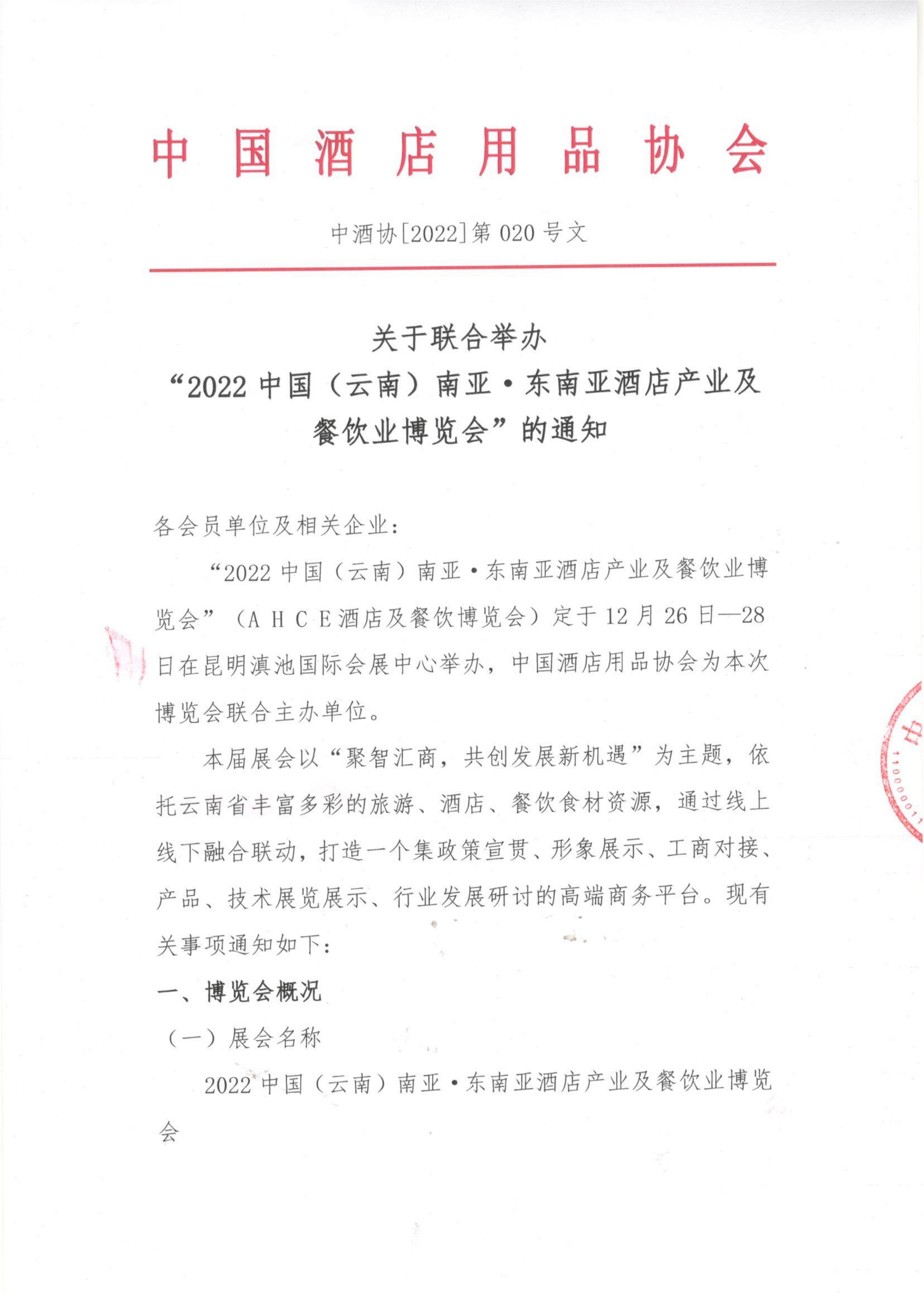 9月19日,中国酒店用品协会与云南万隆会展服务有限公司正式签署战略合作协议,官宣中国酒店用品协会正式作为2022中国(云南)南亚·东南亚酒店产业及餐饮业博览会的联合主办单位,A H C E南亚酒店产业及餐饮业博览会定于12月26日—28日在昆明滇展举办,展览面积3万平米,预期50000人次参观。展会以“聚智汇商,共创发展新机遇”为主题,依托我省丰富多彩的旅游、酒店、餐饮食材资源,通过线上线下融合联动,打造一个集政策宣贯、形象展示、工商对接、新产品展览展示、行业发展研讨的会展商务平台。