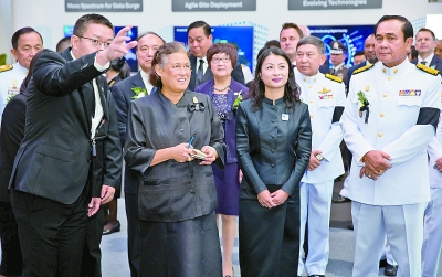 图为华为技术有限公司为来展台参观的泰国公主诗琳通(前左二)、泰国总理巴育(前右一)介绍最新技术成果。马勇幼供图