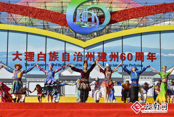 大理州委副书记、州长杨健在致辞时首先用白族话向全州百姓表示了祝贺。他说,60年前的今天,在党中央、国务院的亲切关怀下,大理白族自治州正式成立,开启了实现人民幸福的新征程。60年来,在党的民族政策光辉照耀下,历届州委、州政府团结带领全州各族人民艰苦奋斗、砥砺前行,在波澜壮阔的改革发展进程中,各项建设事业取得了令人瞩目的成就,白州大地发生了翻天覆地的变化。
