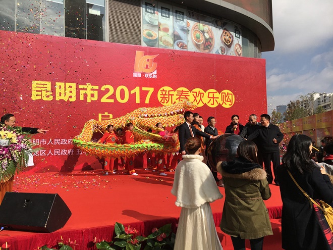为满足市场多样化需求,丰富昆明市元旦、春节市,促进实体商业转型升级,确保消费实现“开门红”,由昆明市人政府、云南省商务厅主办,昆明市五华区、盘龙区、官渡区、西山区、呈贡区人民政府、昆明市商务局承办的昆明市2017新春欢乐购物活动于2016年12月30日上午,在昆明市同德广场举行启动仪式。昆明市人民政府孟庆红副市长致辞,省商务厅张红霞副厅长出席启动仪式并宣布开幕,健之佳等企业代表现场签署商家诚信书。