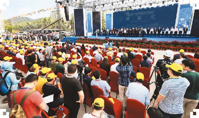 海南省副省长李国梁宣布2017海南国际旅游贸易博览会盛大开幕并与中外嘉宾拿起海螺,共同向注水口倒入海水,同时多条蓝色彩带飞越而出,寓意全世界汇聚于海南国际旅游岛,汇聚于美丽的三亚,汇聚于2017海南国际旅游贸易博览会(以下简称:海博会),象征着来自海内外客商相聚海南共襄盛举,经贸、旅游、文化在海南这个“一带一路”重要战略支点上交融汇聚。