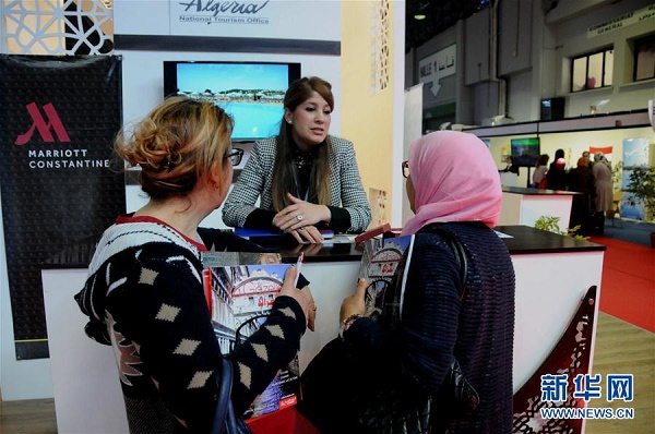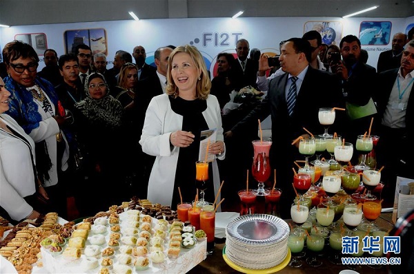 4月5日,在突尼斯首都突尼斯,突尼斯旅游部长塞尔马·埃卢米·雷基克(中)参观旅游业复苏交易展会。当日,突尼斯克拉姆展览馆举办突尼斯旅游业复苏交易展会。展区分为国际旅游市场、酒店餐饮、海盐水疗、医疗旅游和游艇水上运动五大主题,来自阿尔及利亚、埃及、印度尼西亚、南非等国的展商也参加了展会。新华社发(阿代尔摄)