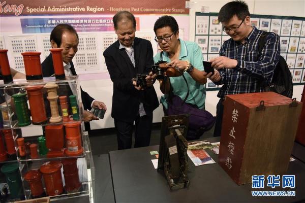 4月11日,参观者在香港大会堂拍摄英国皇家邮政一款1960年代的“小本邮票销售机”。为庆祝香港回归祖国20周年,香港中国邮学会于4月11日至4月13日在香港大会堂举行“庆祝香港特别行政区成立20周年邮票展览”。本次展览除展出邮集外,还将举行集邮讲座。新华社发(王申 摄)