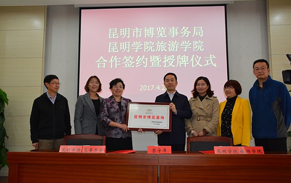 4月26日,昆明市博览事务局与昆明学院旅游学院签订合作备忘录并举行授牌仪式。昆明市人民政府副市长洪维智与昆明学院副校长熊晶共同为“昆明市博览基地”揭牌。昆明市博览事务局局长周燕、副局长边莹、广东会展企业协会会长刘松萍出席了授牌仪式。