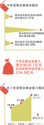 伴随着《昆明市会展业促进条例》《昆明市会展专项资金管理试行办法》《昆明市会展活动管理办法》等一批利好政策的相继出台,昆明会展业的营业收入也从2015年的18.48亿元增加至2016年的21.88亿元再到今年的26.1亿元(预计数)。特别是今年,昆明市博览局与昆明云安会都酒店合作在北京设立昆明会展(北京)促进中心,与云南风光优景会议展览有限公司合作在上海设立昆明会展(上海)促进中心,在广州设立昆明会展(广州)促进中心,借力北上广发展昆明会展业有了更好的抓手。